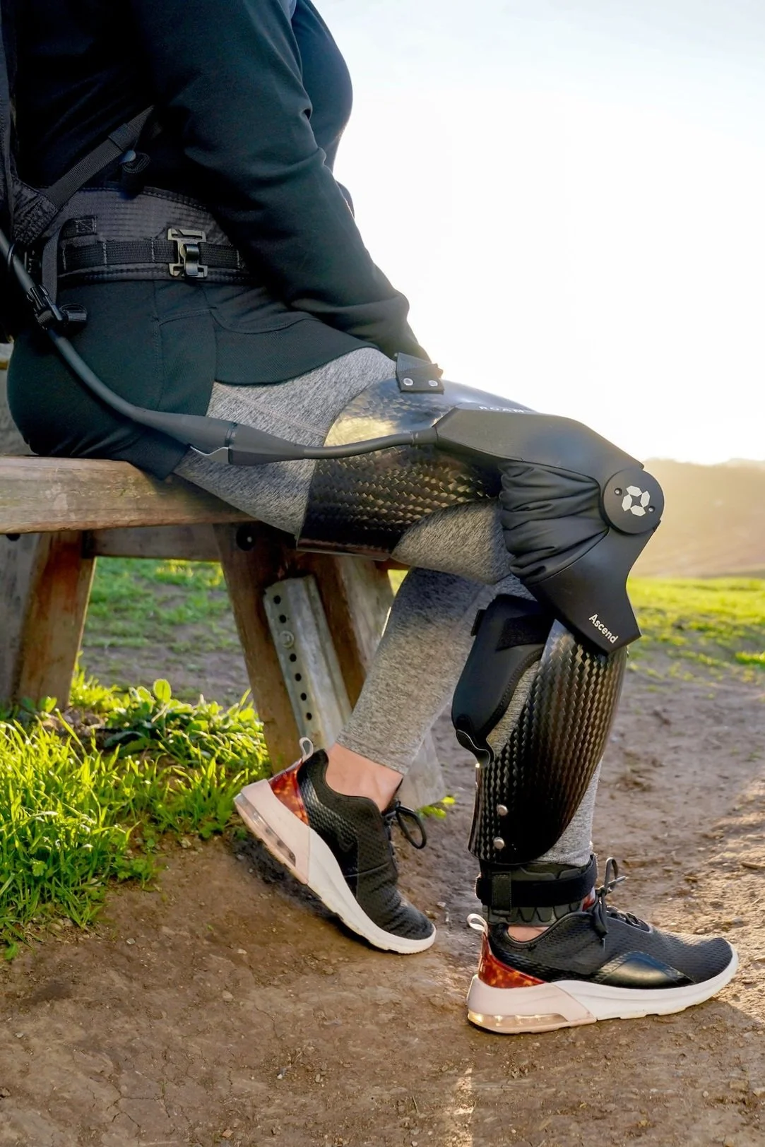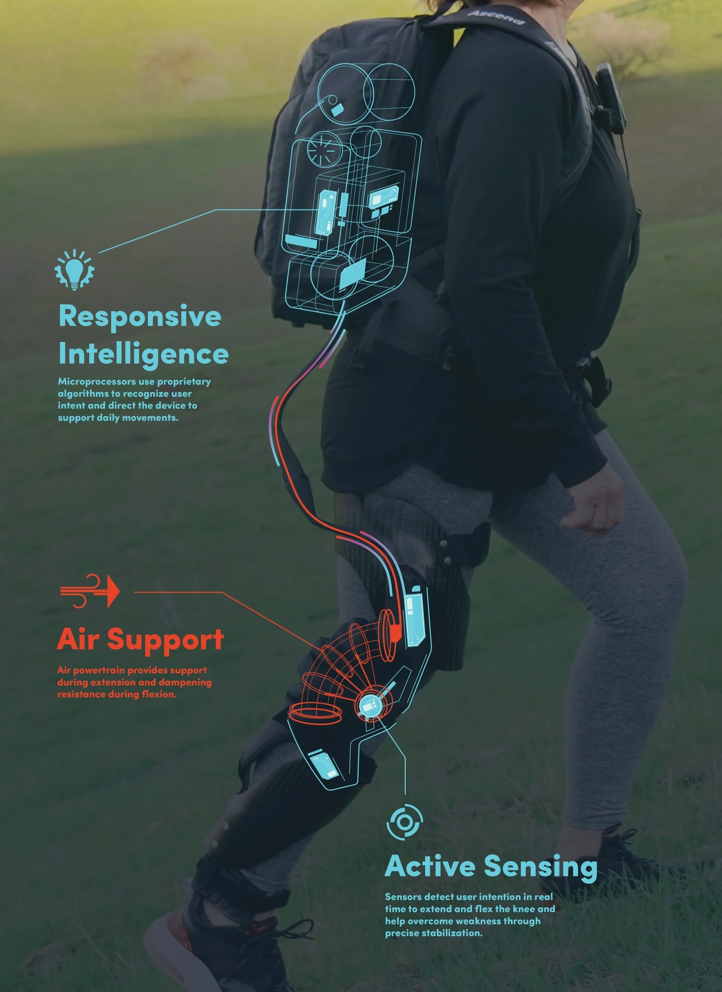“Ascend” is a pneumatically powered, custom fabricated, knee orthosis designed to remove barriers and support mobility for individuals with osteoarthritis, knee pain, joint instability, or muscle weakness.